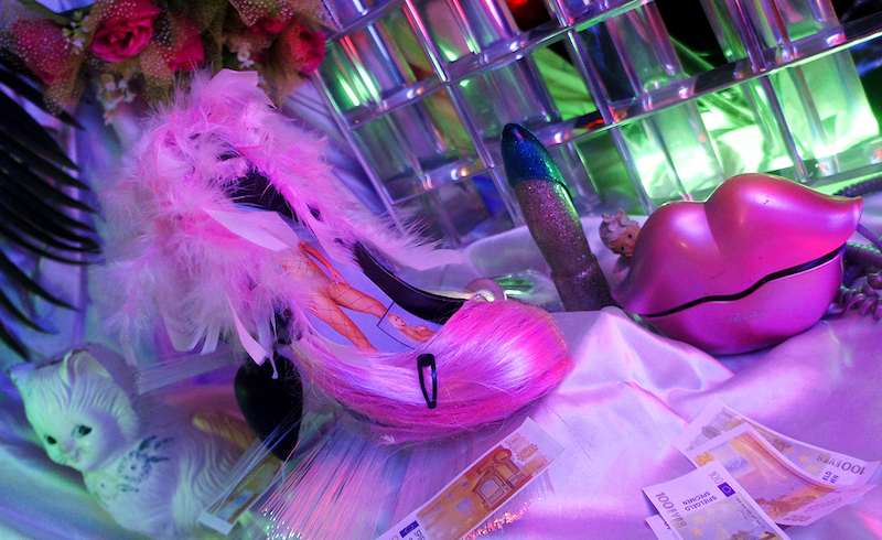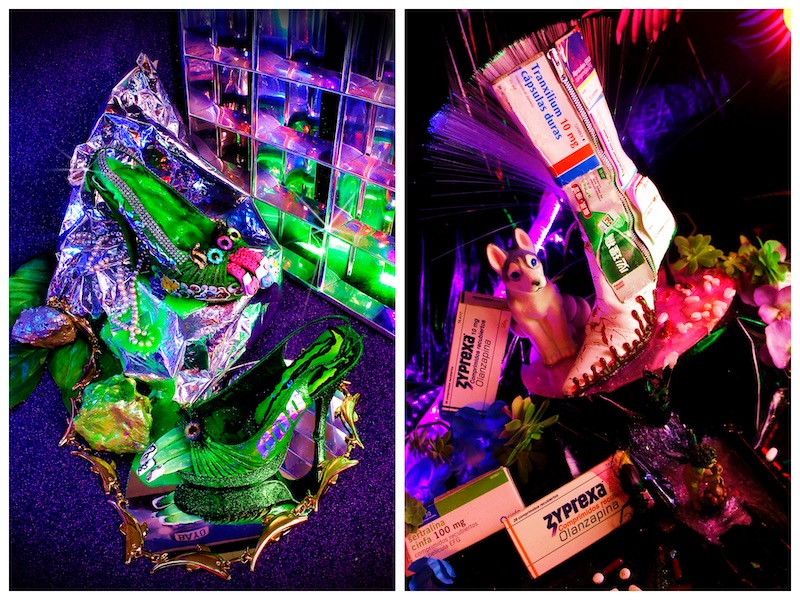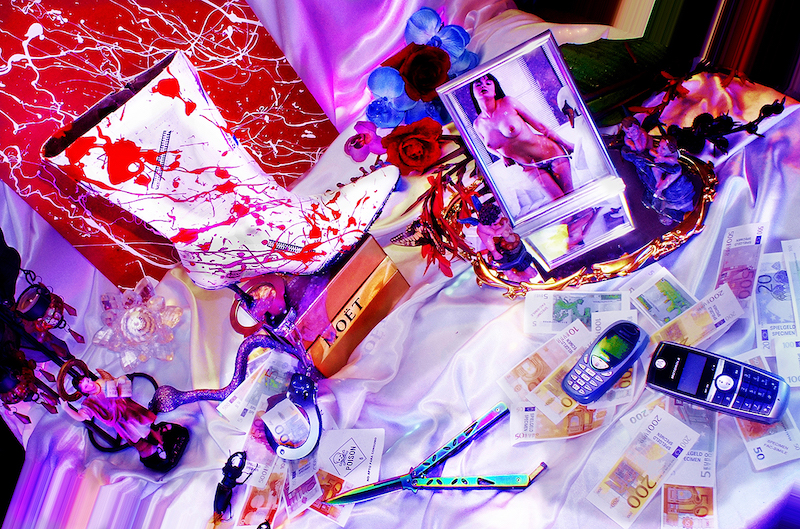 La fotógrafa que como hemos dicho además actúa como diseñadora, estilista y posa como modelo, con su trabajo, asimismo, bucea en una de las narrativas más constantes del arte contemporáneo, la fina división entre la intimidad, lo privado y lo público. Por eso la mayoría de sus fotografías están tomadas en su propio dormitorio, un espacio íntimo a priori que convierte en un escaparate hacia el exterior con luces de neón, maquillaje dark y ambiente metálico.