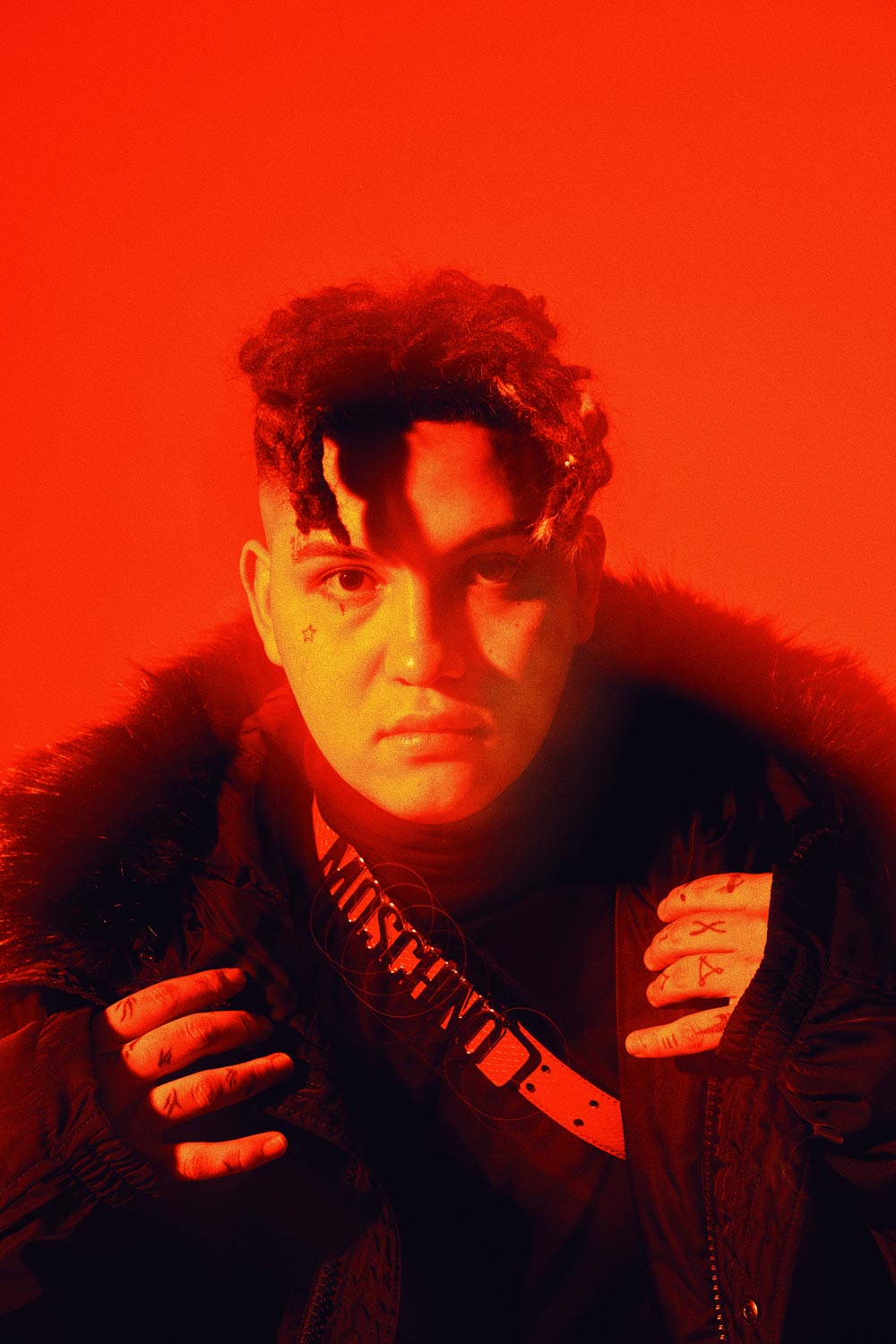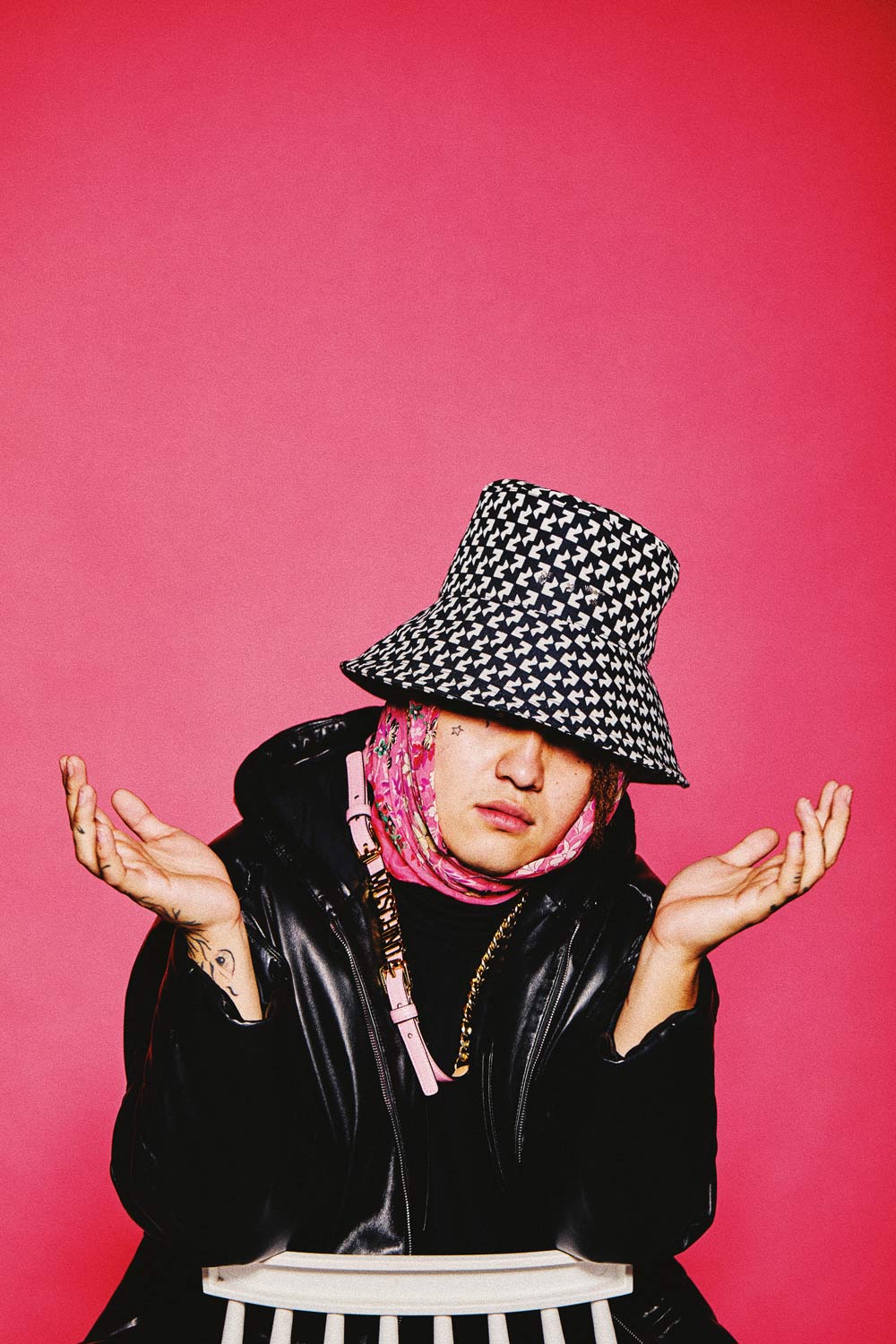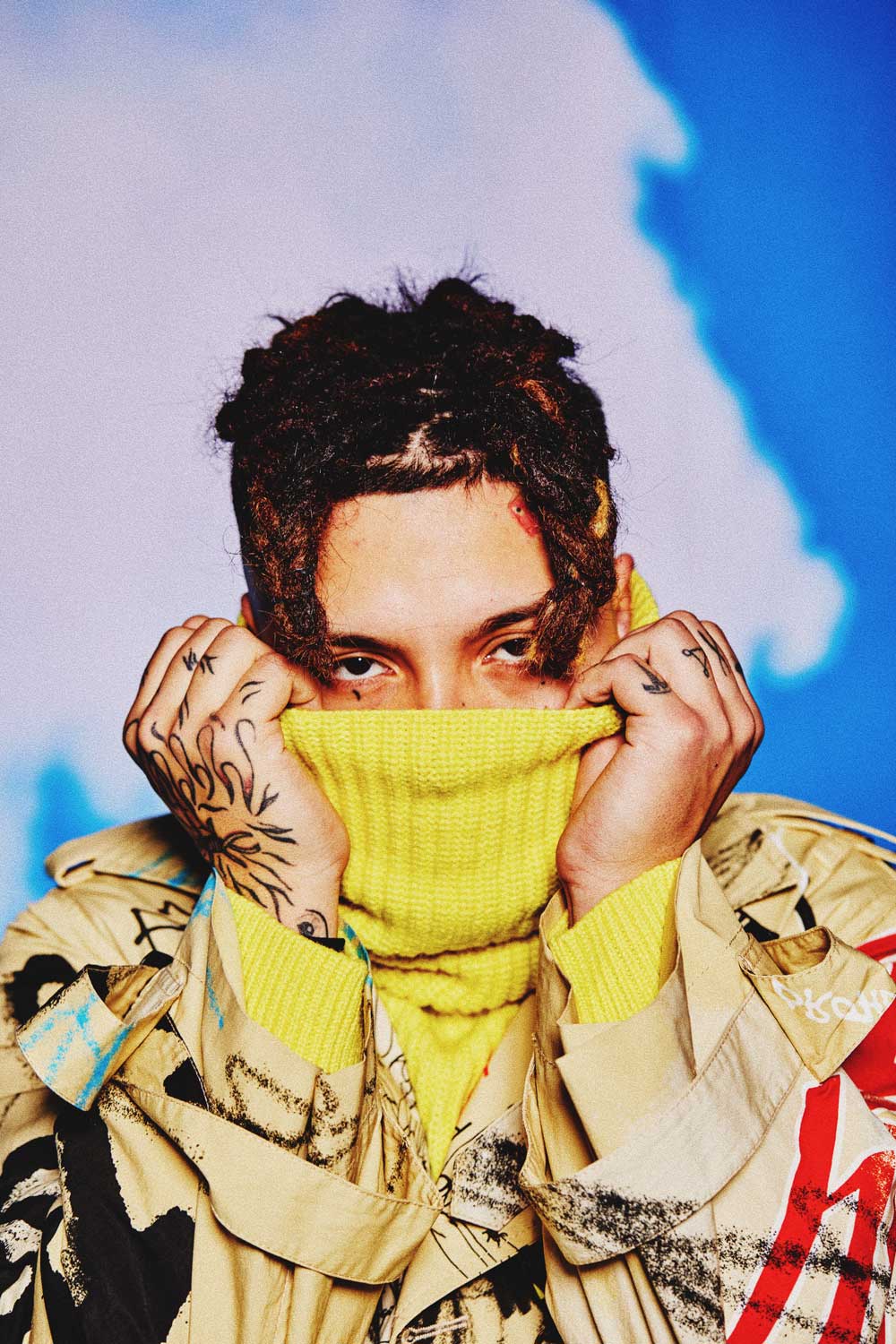El artista chileno Harry Nach con sombrero de OFF_WHTE, bufanda de ETRO, abrigo de JOSEPH y cinturón MOSCHINO
