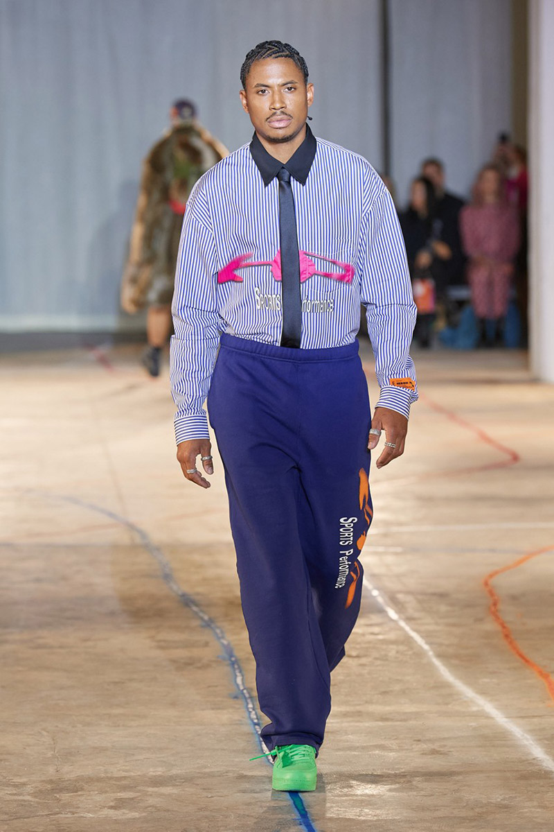 El desfile de Heron Preston abrió con un body transparente; dejándonos saber de primeras que habría un punto sexy y femenino en la colección. Entre un mar de looks urbanos se dejaron ver conjuntos que incluían vestidos satinados con mucho movimiento y claro, el vestido de maya metálica sobre un body negro es uno de los looks al que le debemos prestar más atención.