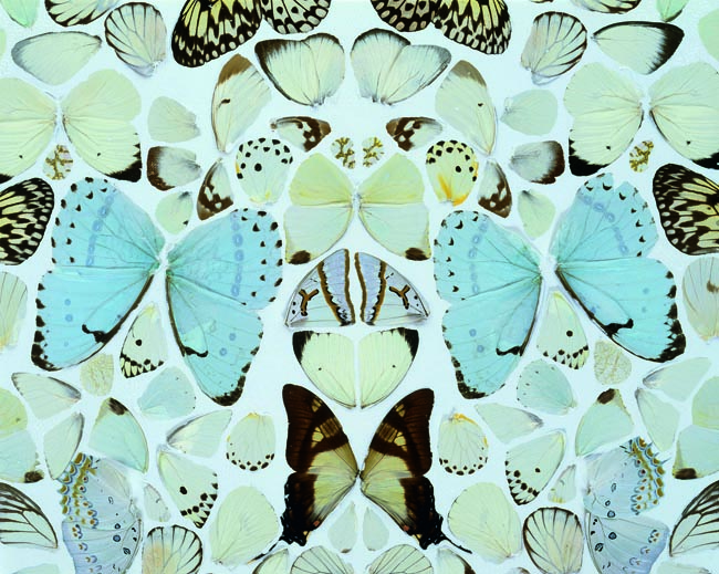 Para Hirst son la herramienta que representa la vida y la muerte. Así aparecen en sus instalaciones, combinados: vivos y muertos. Moscas vivas sobrevuelan a otras muertas y se alimentan en boles de azúcar. Más moscas muertas aparecen lacadas sobre un enorme panel en la pared bajo el título Black Sun (Sol Negro, 2004). Esta pieza provoca el curioso acercamiento del visitante y la inmediata y rapidísima separación de su nariz de este espectáculo para unos grotesco, para otros repulsivo, para otros comunicativo y para la mayoría difícil de explicar. Por el contrario, esta masa negra que integran las moscas muertas se contrarresta con el colorido y con la belleza natural de las mariposas de In and Out of Love (Dentro y fuera del amor, 1991). Se trata de un jardín interior casi tropical con plantas y fruta fresca. Es una de las salas con más atractivo y, aunque la estancia del visitante está limitada a unos pocos minutos, la cola demuestra que merece la pena. Poco después dentro de este circuito hirstiano de repetición, los mismos colores vivos del jardín se despliegan disecados y dispuestos matemáticamente en forma de vidriera bajo un cristal. Hirst descarta los cuerpos de las mariposas y emplea sólo las alas, lo más decorativo, lo más bello, lo más preciado para mostrar la fragilidad de la vida. Con delicadeza y sumo cuidado, la organización de estas ‘extremidades’ da la sensación de una ventana de colores en la pared; una vidriera de reminiscencias medievales bajo un arco gótico que, en la distancia, llama la atención, pero que una vez cercana, provoca cierto rechazo, desconcierto y pensamientos contradictorios. Algunas de estas obras son Sympathy in White Major (Simpatía en blanco mayor, 2006) y Doorways to the Kingdom of Heaven (Puertas al Reino del Cielo, 2007).