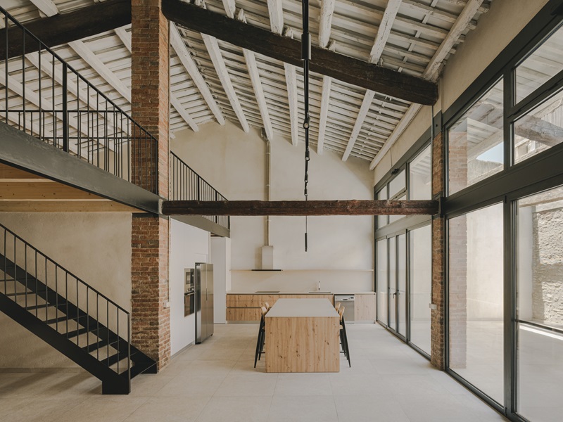 En la comarca de Montsiá, al sur de Tarragona, el pequeño pueblo de Ulldecona destaca por su castillo medieval y sus canteras, donde se extrae la piedra Cenia de color crema tan característica de la arquitectura local. Esta caliza, notable por su dureza, conforma la fachada original y los sólidos muros medianeros de la nave renovada por VVAA Studio. Los arquitectos también han conservado la estructura de pilares de ladrillo macizo y la bella cubierta de madera, que ahora se erige como la protagonista del diáfano espacio interior en un elegante color blanco.