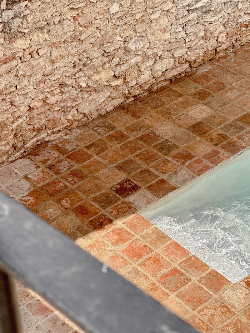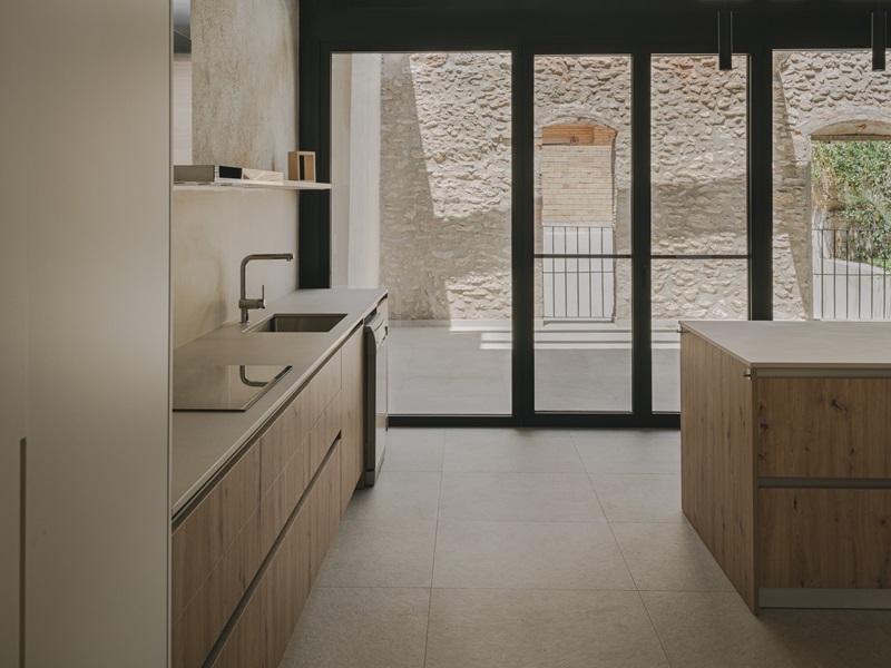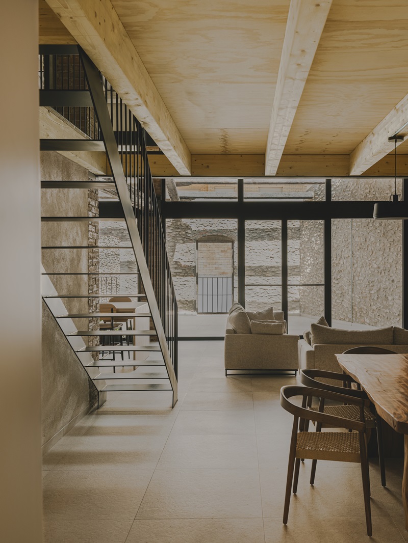Un gran ventanal conecta las estancias principales con la terraza. Este singular espacio exterior semicubierto preserva la fachada de balcones original y cuenta con agradables vistas al patio trasero con piscina situado en el nivel inferior. Para el nuevo pavimento del patio, los arquitectos recuperaron las baldosas de cerámica de barro del antiguo forjado de la nave. Un material, tradicional de las casas del pueblo, que combina a la perfección con la piedra de los muros.