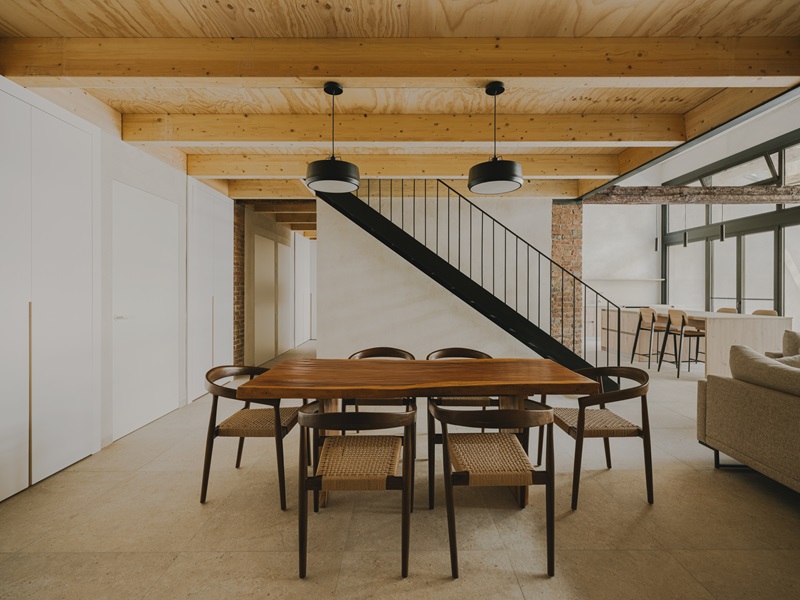 Una esbelta escalera metálica, ubicada entre el comedor y el baño de la planta principal, conduce al altillo. Su color negro contrasta con el cálido tono miel del nuevo forjado, compuesto por vigas de pino laminado y un tablero de contrachapado fenólico a juego.
