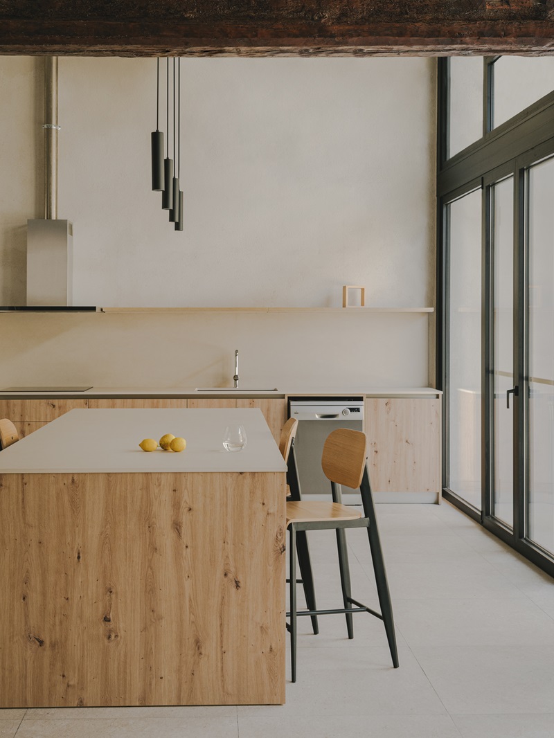 El diseño arquitectónico prescinde de los tabiques en las zonas comunes para promover una circulación fluida y potenciar las conexiones visuales entre el comedor, el salón y la cocina. Las estancias de la zona de día comunican con el altillo a través de la doble altura, que maximiza la sensación de amplitud del espacio y pone en valor la cubierta de la preexistencia. “Las vigas se han pintado de blanco y las jácenas centrales se han limpiado y barnizado para dejarlas vistas. Por el tipo de construcción y emplazamiento suponemos que esta madera de pino melis puede llegar a tener 100 años de vida”, detalla Adcock.