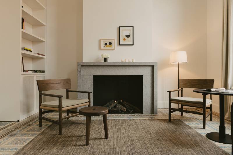 Sus 44 habitaciones y suites — donde alguna vez se alojaron las antiguas viviendas de las monjas — presentan elegantes paletas de verde salvia, blancos cremosos, mármol, madera y tonos leonados. Los suaves suelos de madera están cubiertos con alfombras tejidas a mano, y los baños brillan con azulejos vidriados y artículos de tocador de la marca de culto Le Labo.