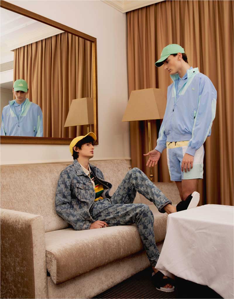 (Izda) Cazadora y pantalón Guess Originals x Pleasures + Polo y gorra Lacoste + Sandalias Birkenstock x Central Saint Martins by Dingyun Zhang