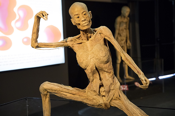 Así, la exposición transporta al visitante a través del sistema óseo, muscular, respiratorio, circulatorio, digestivo, nervioso y urinario-reproductor humanos. Se pueden ver corazones, músculos en movimiento, hígados y estómagos, e incluso unos pulmones ennegrecidos por los efectos nocivos del tabaco en el organismo.