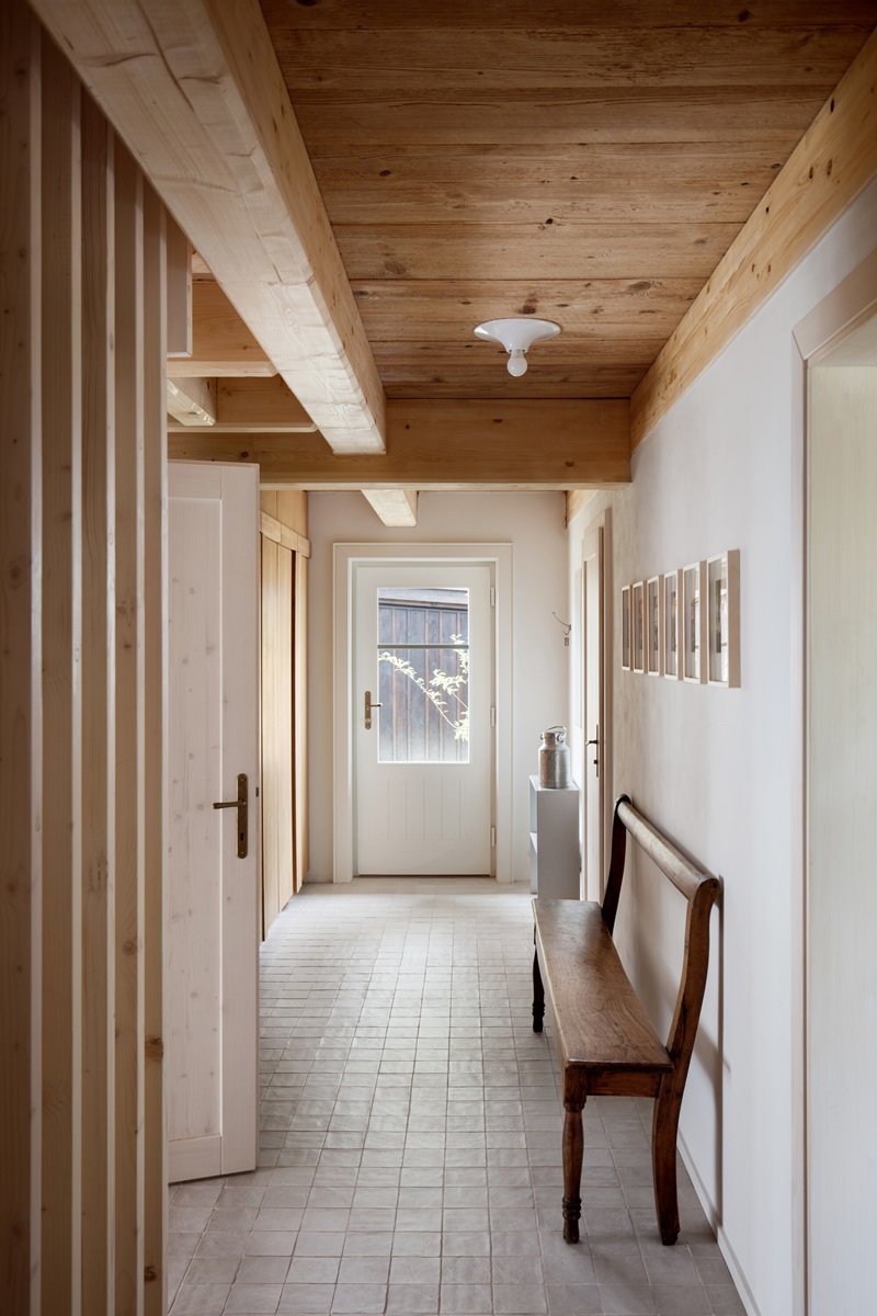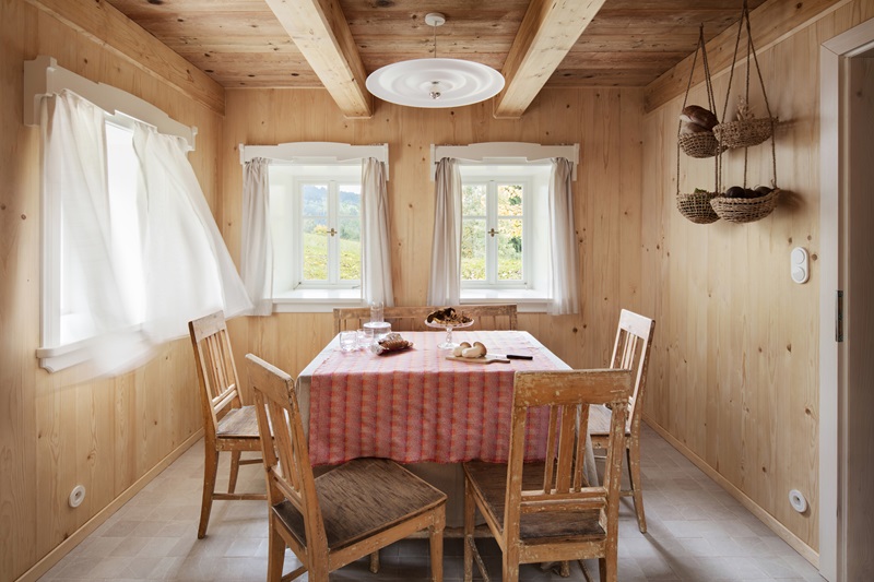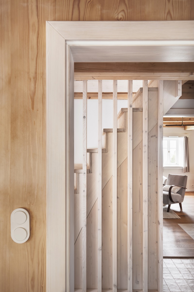 Las fachadas sorprenden por el bello trabajo de la madera natural, propio de la cultura arquitectónica de la región, que ha permitido reconstruir la preexistencia fiel a su origen. Además, se ha preservado la distribución de las estancias, así como la forma de las ventanas de doble acristalamiento. A diferencia del color oscuro que caracteriza a los tablones de la fachada, el equipo de Projectica ha optado por el blanco en las carpinterías de las puertas y ventanas para conseguir un refinado contraste.