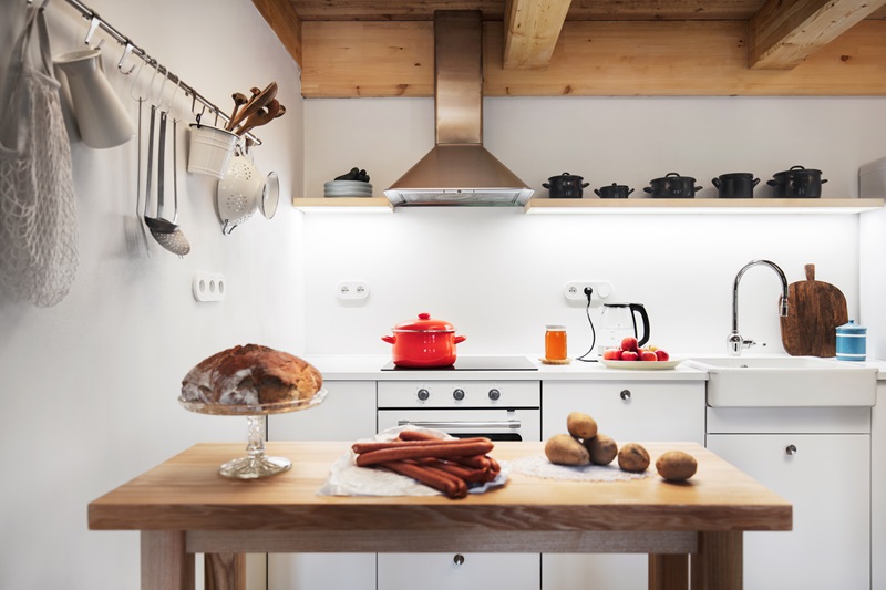 Al otro lado del recibidor, la cocina luce independiente con un encanto rústico que remite al pasado, donde cobran protagonismo las antiguas sillas y mesa de madera restauradas. Ampliamente iluminada por sus tres ventanas, la sala se vuelve especialmente agradable durante la mañana, a la hora del desayuno, por su orientación al este.