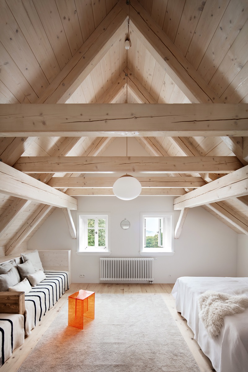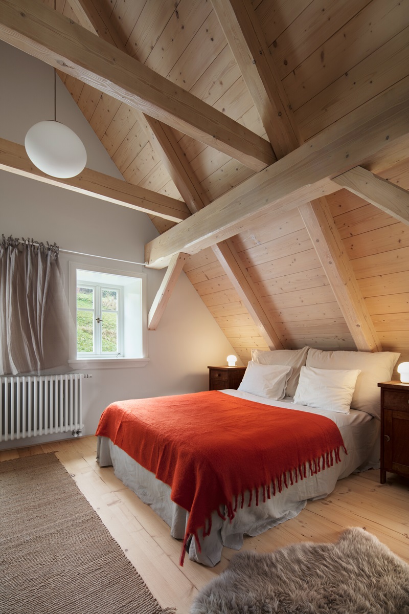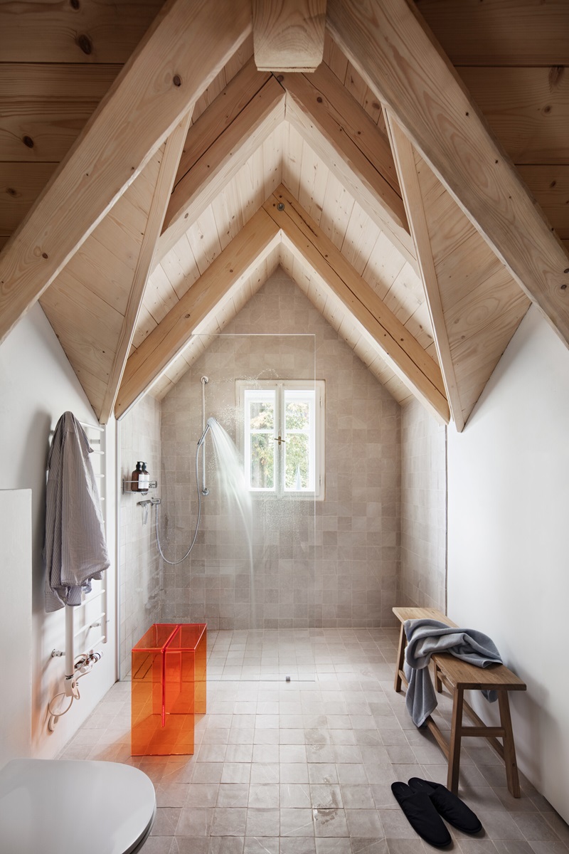 En el nivel superior, las generosas dimensiones de los dormitorios y el baño garantizan una placentera estancia al cobijo de los altos techos inclinados. La diseñadora de interiores Denisa Kubickova ha aplicado el lema ‘Menos es más’ para crear unos interiores cómodos y funcionales. El confort se consigue gracias a los prácticos muebles de esencia nórdica fabricados a medida por los carpinteros locales. Y el carácter más personal lo concede la selecta combinación de piezas de mobiliario restauradas y de diseño contemporáneo. Un dulce hogar en la naturaleza, rehabilitado en armonía con las raíces de la arquitectura local.