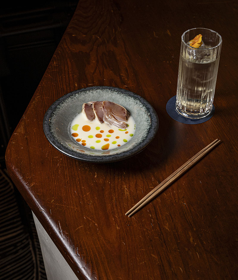 Imágenes superiores: 1) Yong Wu Nagahira y Alberto Fernández, responsables de cocina y coctelería respectivamente. 2) Gazpachuelo japonés con tataki de bonito del norte acompañado del cóctel Highball.