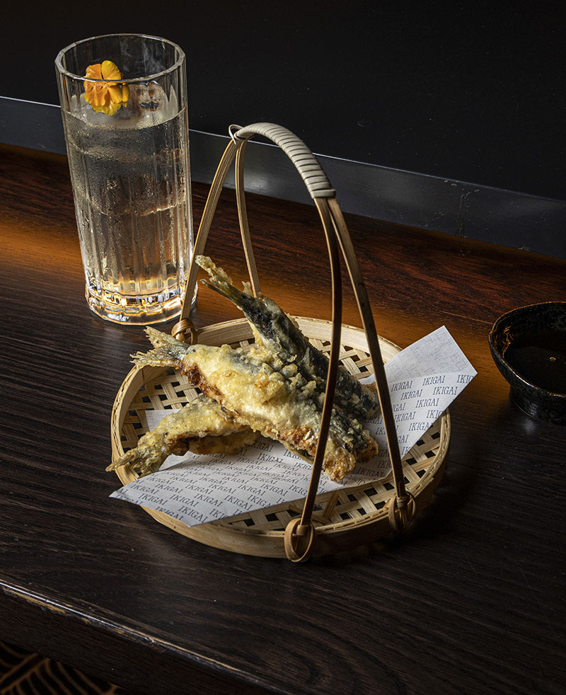 Tempura de sardinas con shiso, umeboshi y salsa gastrique, junto al cóctel Highball.