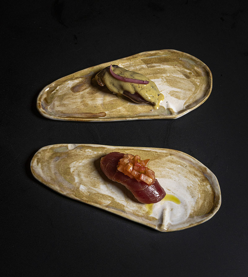 Nigiris de atún con tomate Raff y pez mantequilla con miso dulce.