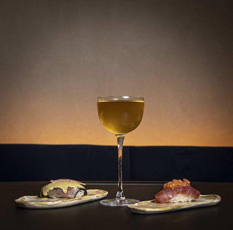 Nigiris maridados con el cóctel Don Miso.