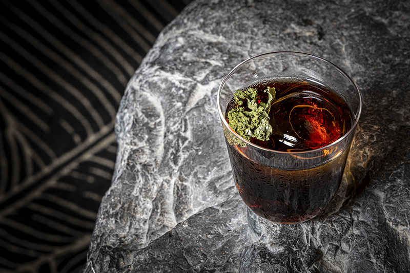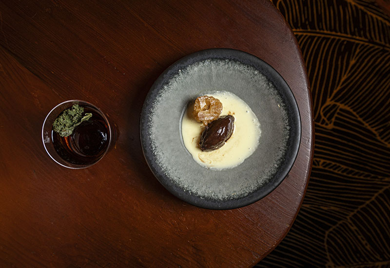 El tramo final queda reservado para el postre, que combina tempura de plátano caramelizado, ganache de chocolate y una sopa fría de coco especiada. El cóctel que lo escolta, Harmony, está elaborado con whisky Hibiki Harmony, amaro, kale y vinagre balsámico de Pedro Ximénez.