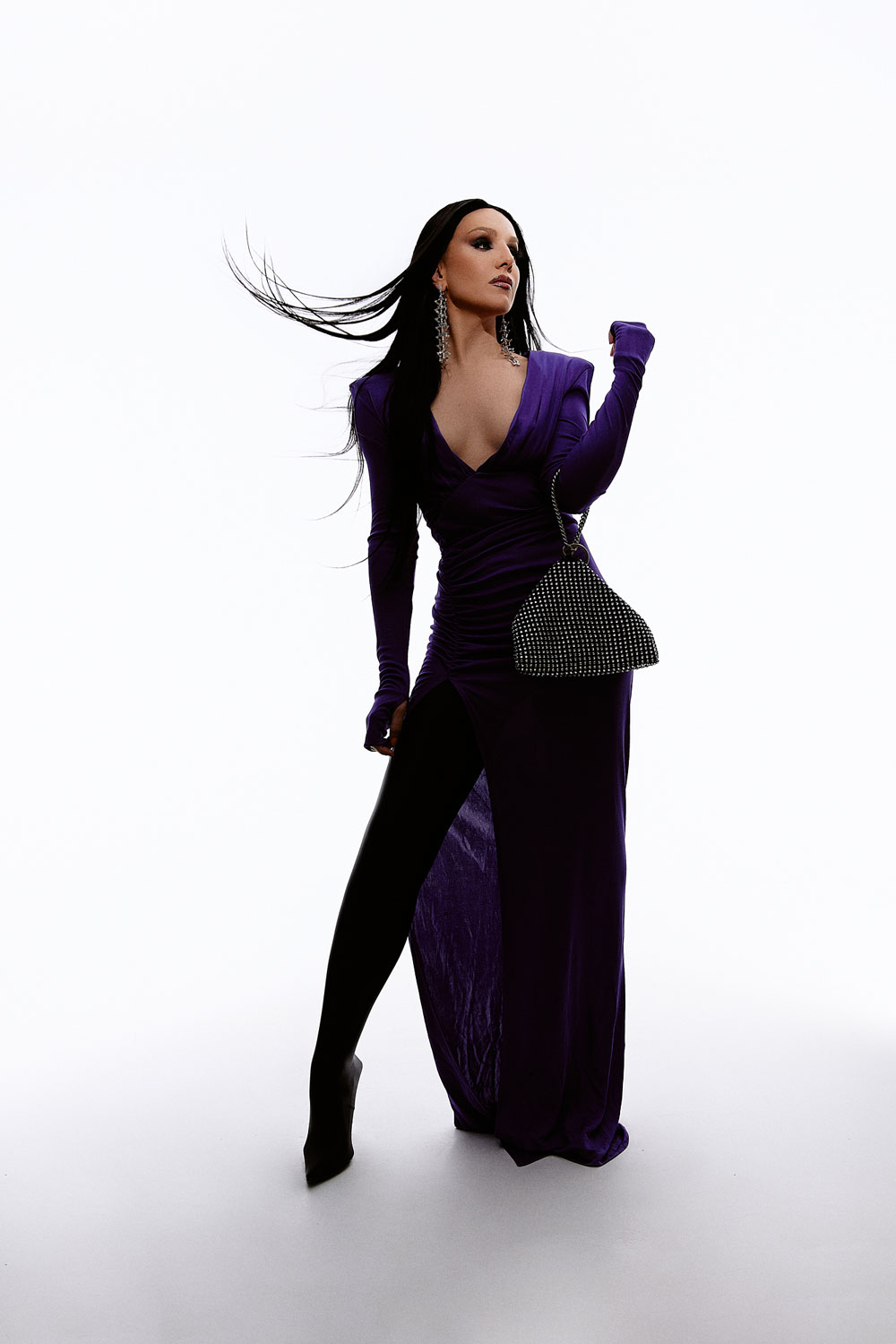Inés Hernand con vestido y bolso de Pinko, botas de Balenciaga y yoyas de Swarovski