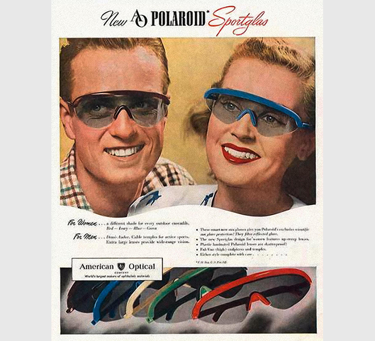 Abajo: Anuncio del año 1946 donde se anuncian las gafas de sol Sportglas de Polaroid, como véis el modelo actual es prácticamente igual al de los años 40. Un diseño con el que se celebran el 80 Aniversario de esta marca creada por Edwin Land en 1937.