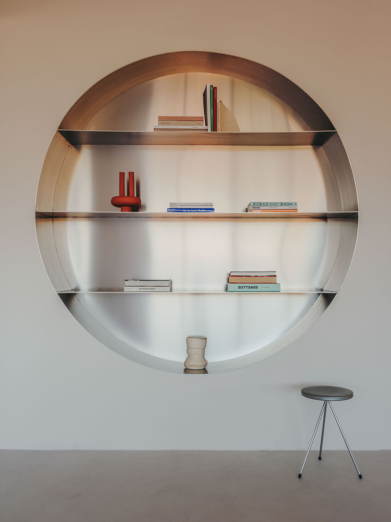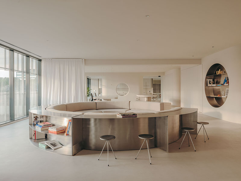 En esta zona, un imponente sofá circular de acero inoxidable, meticulosamente creado para el proyecto, se erige como una obra de arte funcional. Con su diseño único, ofrece una versatilidad excepcional: proporciona un espacio acogedor para conversar en su parte interior, mientras que su perímetro sirve como área de trabajo o almacenamiento de libros inspiradores.