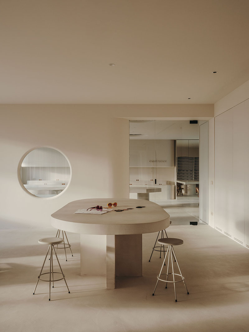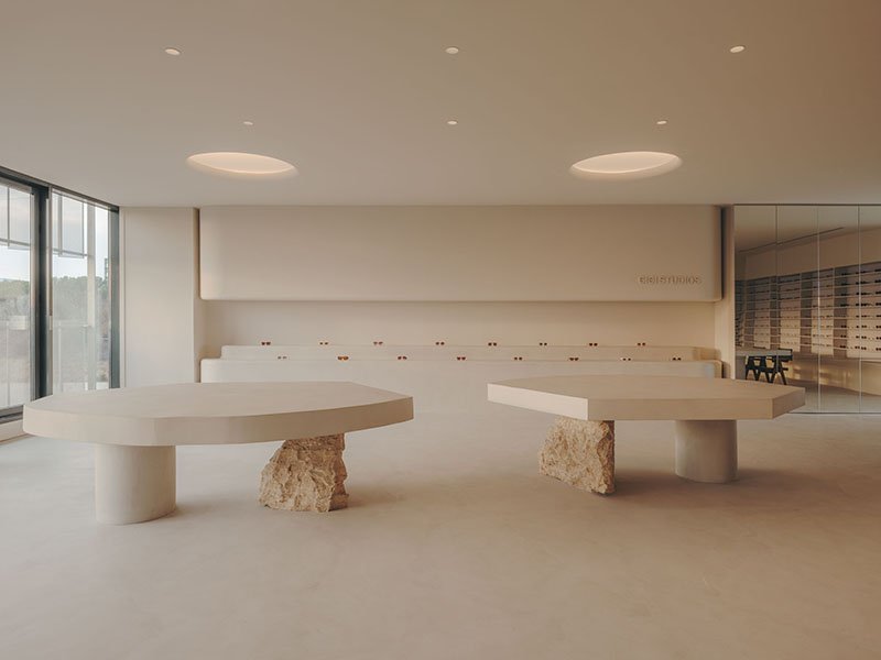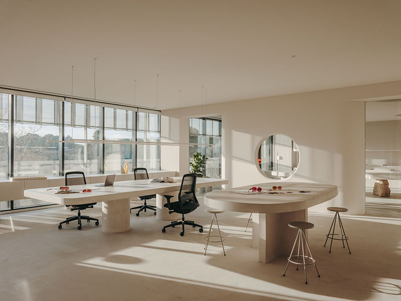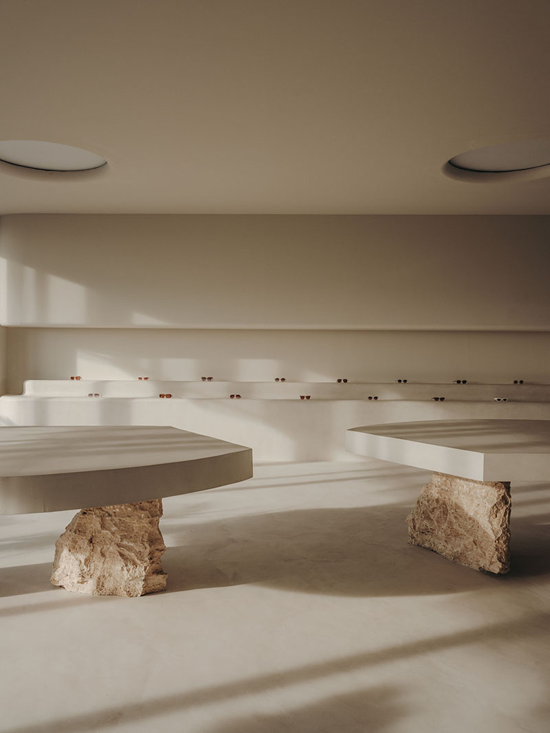 Con un enfoque en el minimalismo, se le otorga el protagonismo merecido a las gafas. Dos imponentes mesas esculturales sirven como expositores para los productos de la marca. Estas mesas, con su diseño impresionante, están formadas por un sobre de hormigón que descansa sobre una roca de travertino romano, tallada por los artistas de la cantera Barbany. Son estas piezas las que coronan el espacio, dándole un carácter único y distintivo.