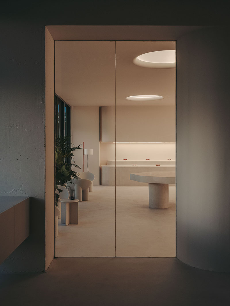 Al adentrarse en el showroom, los visitantes son recibidos por una apertura circular con bordes suavemente redondeados, que ofrece una vista cautivadora del espacio más distintivo del proyecto. Dividido en dos zonas, el showroom ofrece tanto un área de exhibición como un espacio para reuniones.
