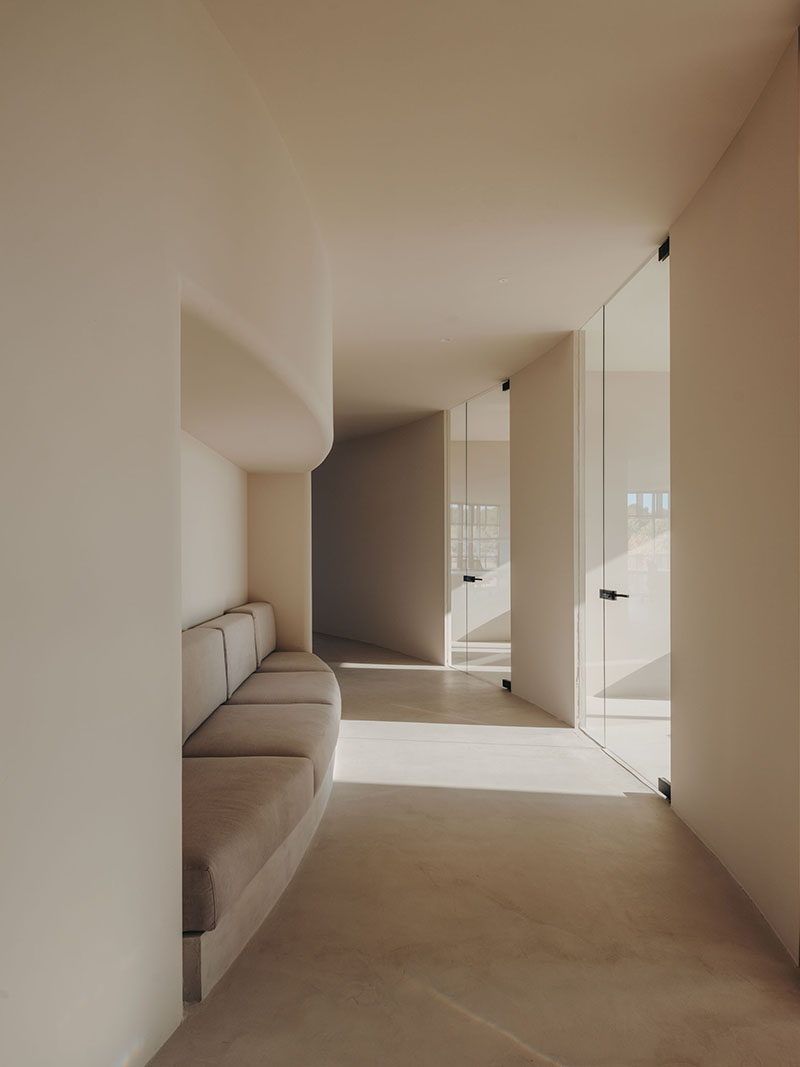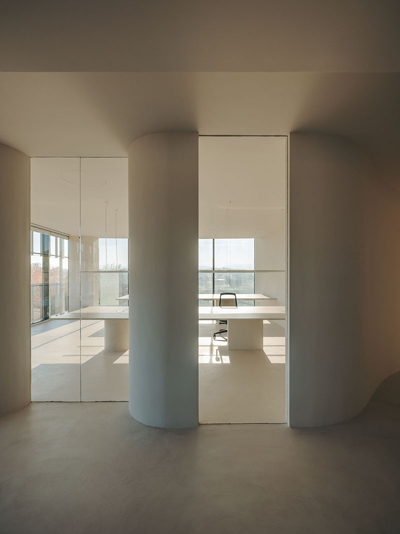 La disposición de los despachos se resuelve con un túnel curvado que integra un sofá nicho en la pared, proporcionando acceso a las diferentes oficinas privadas. Aunque son los espacios cerrados más pequeños, destacan por sus impresionantes vistas. Una vez dentro, una columna arquitectónica brinda soporte a la mesa de hormigón, mientras que un mueble auxiliar de madera se utiliza para organizar elementos personales.
