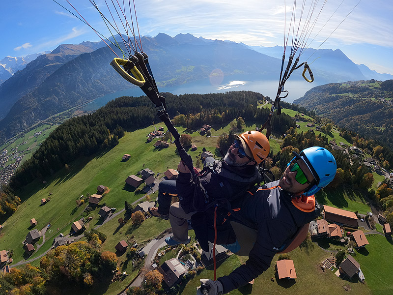 En el centro de Interlaken nos encontramos con nuestro contacto de la empresa Skywings Paragliding que nos tiene preparado un vuelo de parapente en tándem. Cada uno de nosotros volaremos con un piloto, como un bebé en el pico de una cigüeña. Subimos en furgoneta unos 800 metros de desnivel para despegar desde una pradera y bajar planeando durante unos 20 minutos para aterrizar en el mismo centro de la ciudad.