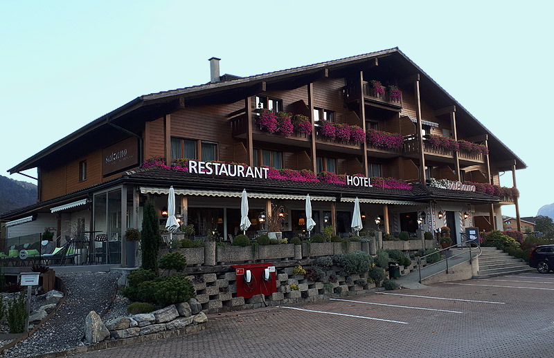Dejamos los equipajes en el hotel Salzano, nuestra base los próximos 2 días, preciosa construcción de madera con olor a pino, a 800 m del lago de Thun, con una magnífica vista de los Alpes.