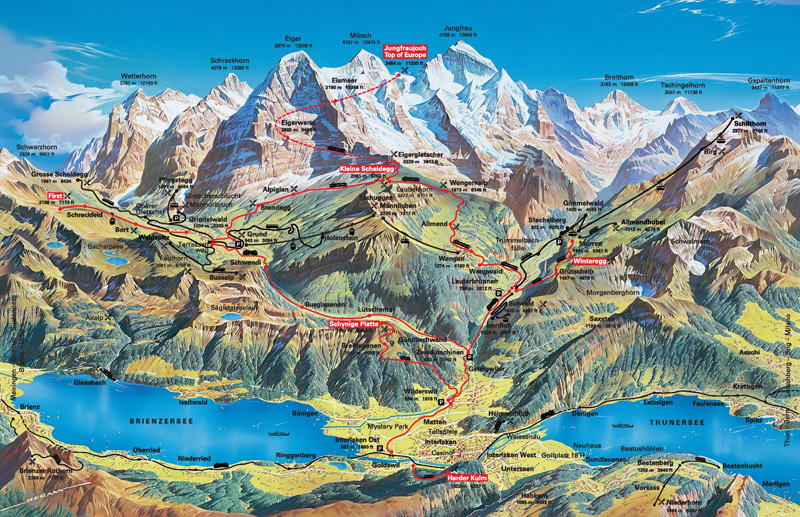 Interlaken y Grindelwald son sus localidades de referencia, comunicadas magníficamente por una serie de trenes y funiculares a cargo de la compañía Jungfrau Railways. La estación de Jungfrau se convirtió en 2.001 en la primera en ser nombrada “Patrimonio Mundial de la Unesco”. Uno de sus mayores atractivos es el Jungfraujoch, la terminal de tren a más altura de Europa, 3.454 metros sobre el nivel del mar. El acceso a la estación se realiza a través de un túnel excavado en la roca, al que se llega en uno de los funiculares más modernos del mundo.