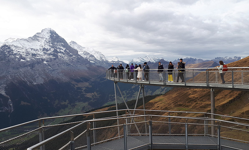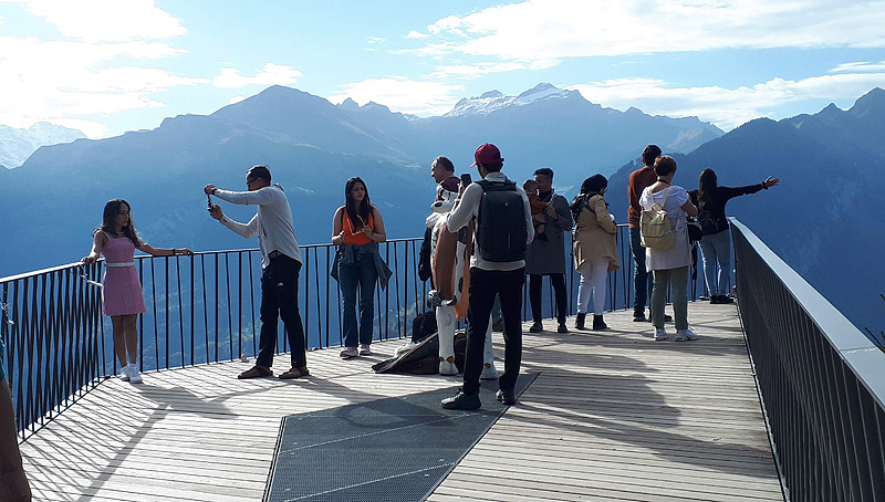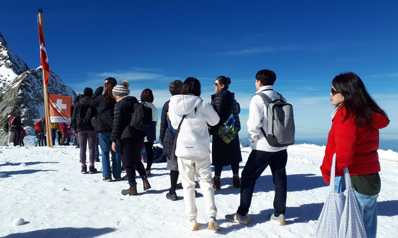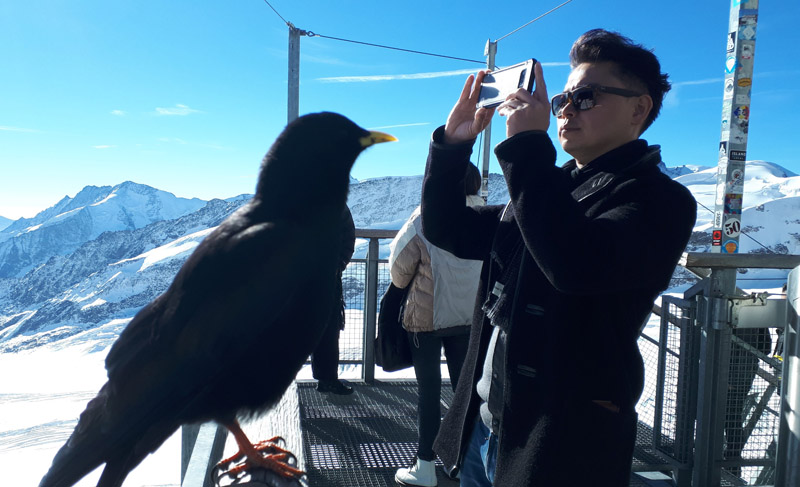 Cientos de turistas asiáticos deambulan de aquí para allá buscando el mejor fondo para el selfie de Instagram, los coreanos hacen cola para fotografiarse junto a una bandera Suiza, y las chovas piquigualdas (una especie de cuervo) se atreven a comer de la mano de los visitantes.
