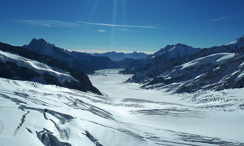 Quedamos sin aliento ante el poder de la naturaleza que se despliega ante nuestros ojos: a un lado la vista del Mittelland hasta los Vosgos, al otro el glaciar Aletsch, bordeado por colosos de cuatro mil metros.