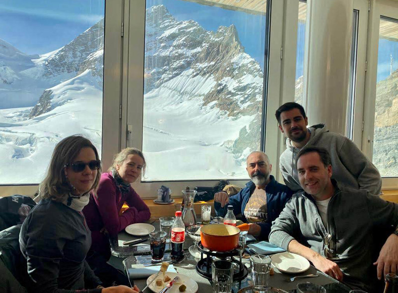 Comiendo con mis compañeros de viaje Elena, Eva, Javier y David en el restaurante de Jungfraujoch. Foto por cortesía de Eva Martos / Desnivel.