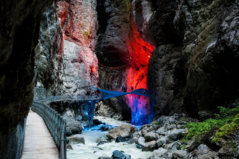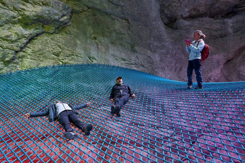 Cogemos tren y autobús para dirigirnos al glaciar George. En realidad lo que queda de él es un cañón de mas o menos 100 metros de profundidad que el deshielo ha ido excavando en la roca durante miles de años. Por aquí fluye el río Lütschine saltando de roca en roca, y sobre él nos divertimos un rato en la Spiderweb, una gran estructura de red de 170 m2 en la que se puede hacer equilibrio y trepar.