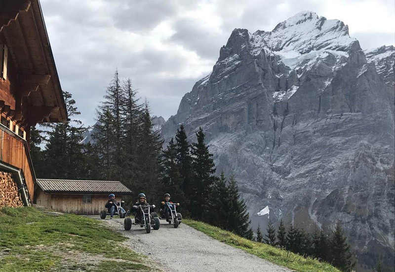 Seguimos a lo nuestro: Nos deslizamos por 2 tirolinas que alcanzan hasta 84km/h, la First Flyer y First Glider. Montamos en una especie de triciclos llamados First Mountain Cart con los que gracias a la fuerza de la gravedad descendemos valle abajo atravesando el maravilloso paisaje y por último la First Trottibike Scooter, una mezcla de patinete y bicicleta muy divertido con el que bajamos hasta Grindelwald, parando aquí y allá para hacer fotos y disfrutar de este regalo de la naturaleza.