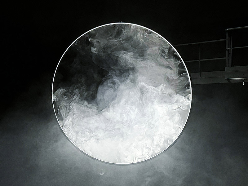 La abstracción digital anterior da paso a Diapositive, de Children of the Light. Esta escultura circular en rotación modula la sala neblinosa con la luz espectral de un eclipse.