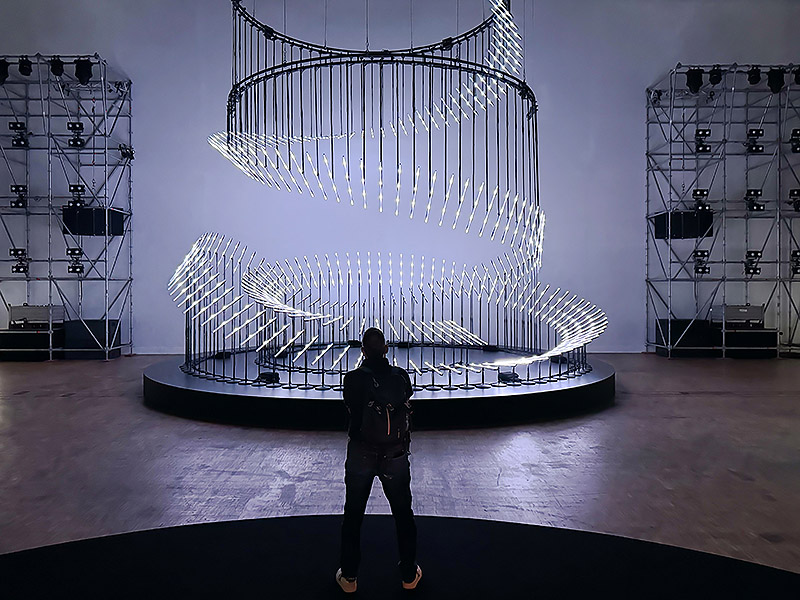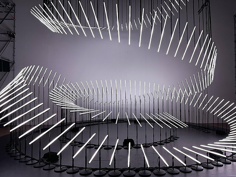 Olivier Ratsi desorienta la percepción en Negative Space. Esta cámara brumosa iluminada por tubos verticales actúa como un portal multiplicado que emerge y se disuelve sin cesar. Un espacio mental, cargado de extrañeza, donde la geometría deviene lenguaje críptico.