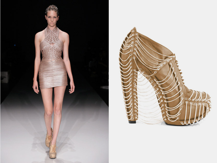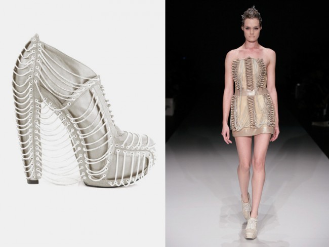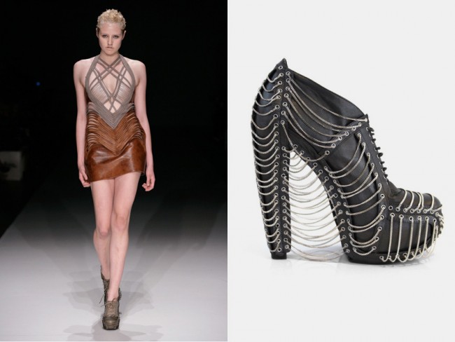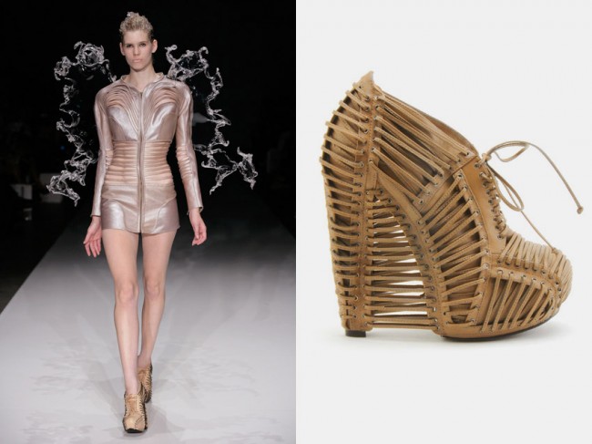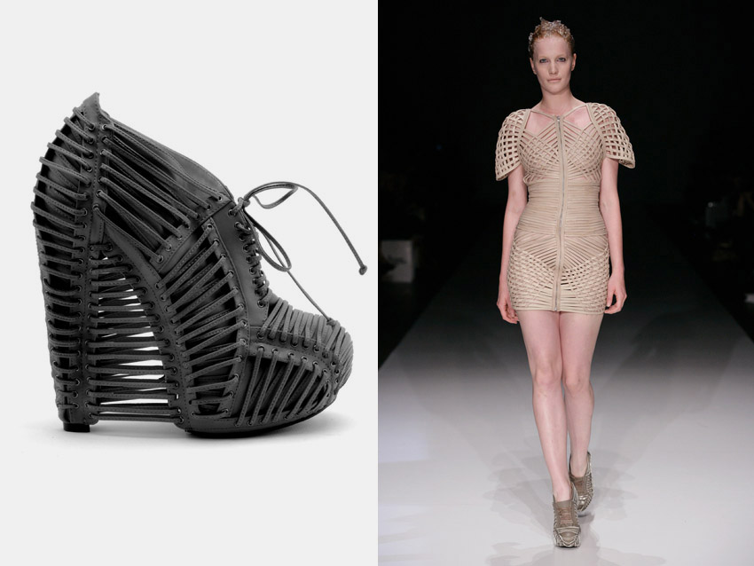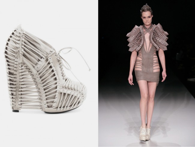 United Nude, firma de calzado creativo creada por Rem D. Koolhas y Galahad Clark, vuelve a unirse a la diseñadora Iris Van Herpen para crear una línea de calzado femenino increíble. Un botín en 2 versiones (cubierta entrelazada o encadenada) y 3 acabados cromáticos (blanco, negro o marrón). Precio: 850 euros. La autora es la joven diseñadora holandesa de 27 años, Iris Van Herpen, el último gran nombre de la moda creativa. Un ejemplo de como la convivencia entre innovación y artesanía es el futuro.
