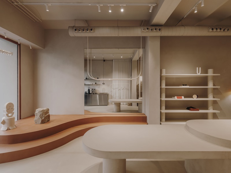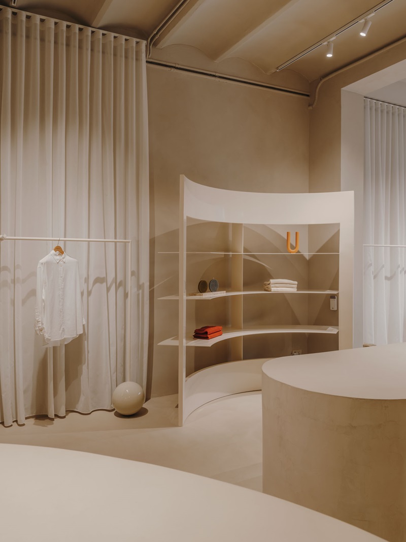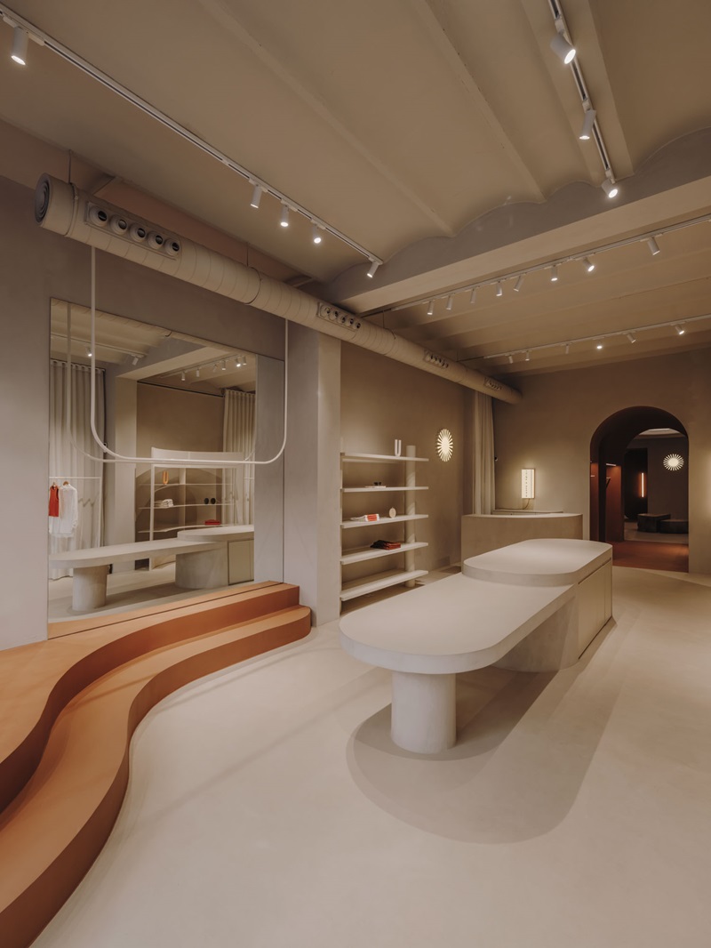 El tono terracota también se utiliza en la plataforma escalonada curva que da forma al escaparate, donde se exhiben varias obras de arte. Y es que, en esta tienda, incluso el mobiliario adquiere una dimensión escultórica, como la monumental mesa de microcemento que preside el espacio con un tablero de dos niveles para mostrar mejor los distintos productos. Junto a las paredes, los percheros y estanterías exhiben la colección de prendas con un diseño original. Por ejemplo, la burra tiene como bases una esfera de hierro y una roca maciza, creando una conexión entre lo geométrico y lo primitivo. O la estantería de hierro está diseñada con una forma semicircular para aportar un toque de dinamismo al espacio.