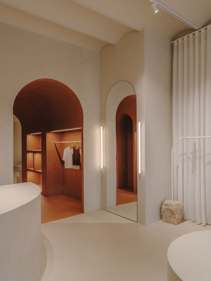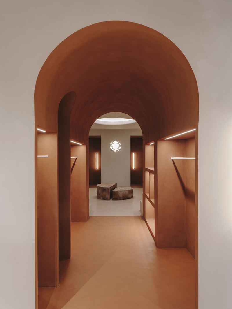 El acceso a los probadores es similar al deambulatorio que da ingreso a las capillas situadas en el ábside de las iglesias. Un corredor semicircular, que crea una mayor sensación de profundidad y aporta privacidad. Las tres cabinas se encuentran detrás de unas largas cortinas de color claro, que contrastan con el acabado terracota del pasillo de entrada.