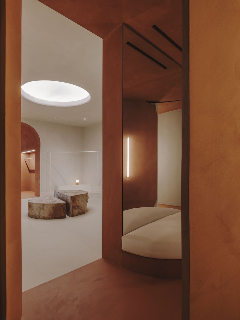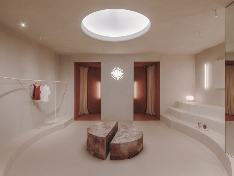 Un túnel arqueado de color terracota conduce a la parte más privada de la tienda, donde se encuentra una sala de gradas con reminiscencias de los anfiteatros del mundo clásico. Sorprende especialmente el óculo de luz artificial que procura iluminación cenital a la estancia y la escultura central de la diseñadora Sara Regal, que puede utilizarse a modo de mesa. Esta pieza es fruto de un interesante proceso de producción, basado en la reutilización de los escombros generados en la propia reforma.