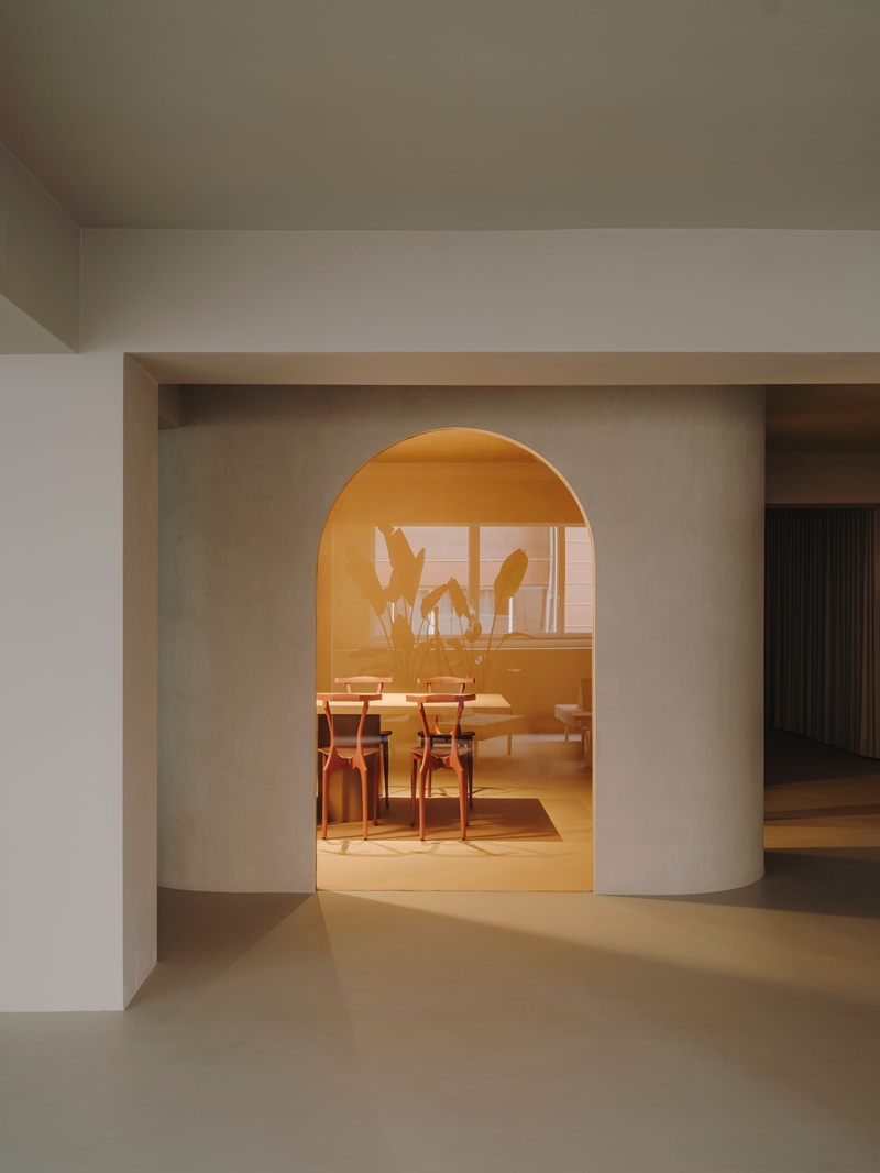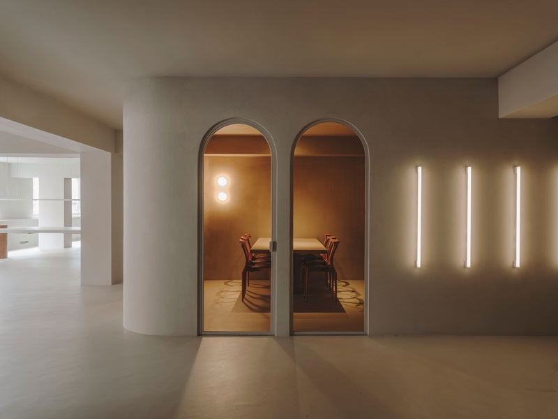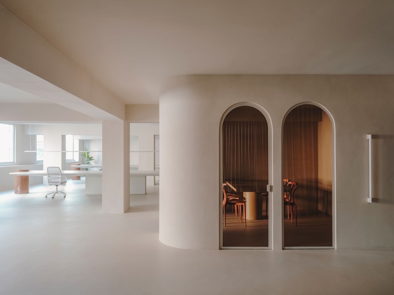 Un volumen central, de contornos redondeados, irrumpe en el centro de las oficinas, dando forma a la sala destinada a la celebración de reuniones privadas. Sus dos puertas y ventanas de cristal con forma arqueada aportan un aura de grandiosidad al espacio, ensalzado por el color terracota de sus interiores, que genera una atmósfera cálida y acogedora.