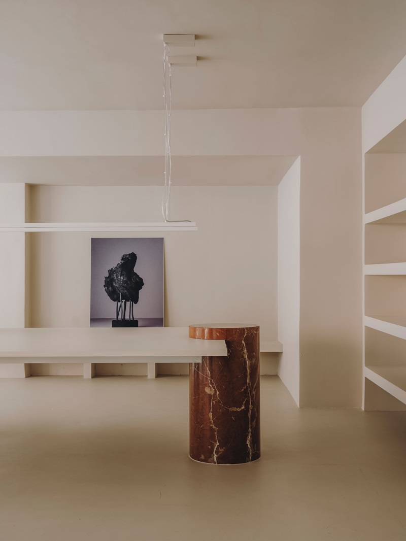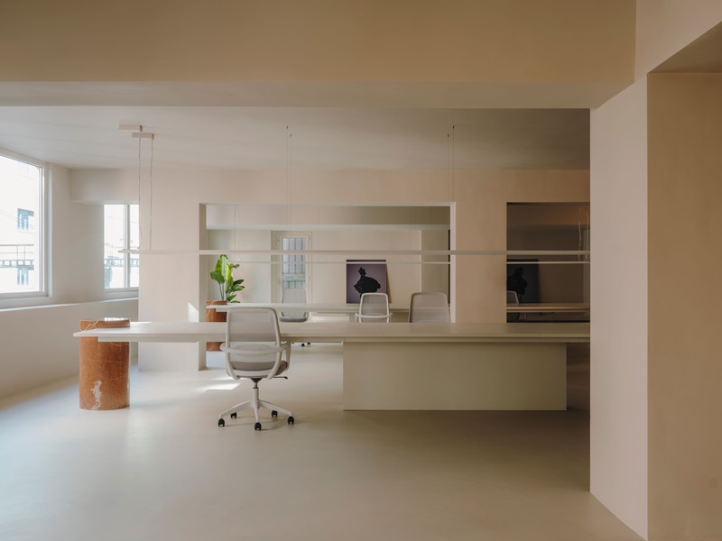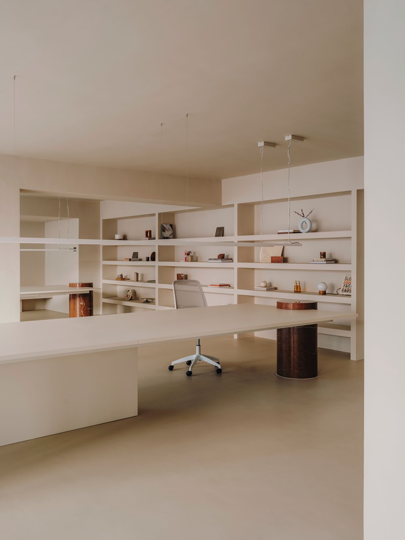 Los puestos de trabajo se distribuyen a lo largo de un espacio abierto que apuesta por la circulación fluida. El mobiliario está presidido por dos mesas de generosas dimensiones que favorecen la interacción social y las colaboraciones en grupo. Su elegante diseño a medida se compone de un alargado tablero de formica color lino, que descansa sobre un cilindro de mármol rojo Alicante, estableciendo conexión con la isla de la cocina. En el lado de la pared, una estantería de obra empotrada sirve de expositor de piezas de diseño, mientras que, en el lado opuesto, amplias ventanas permiten la entrada de luz natural, elevando la sensación de confort en el entorno laboral.