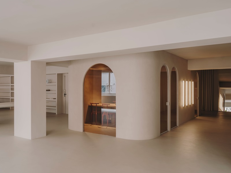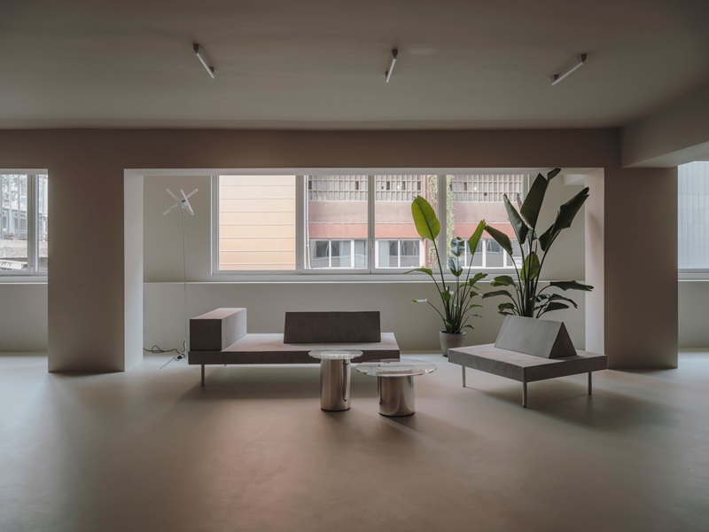 El diseño de las oficinas de Plate selector se caracteriza por un depurado estilo minimalista, que el equipo de Isern Serra singulariza a través de las superficies orgánicas presentes en los distintos rincones del diáfano espacio, unificado por el color crudo de sus paredes y pavimento continuo de microcemento.