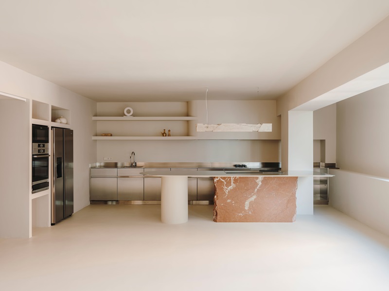 La cocina adquiere protagonismo con el gran bloque de mármol rojo Alicante que conforma la base de la isla curva de acero inoxidable. Su vivo color contrasta con el tono crudo que envuelve la estancia, así como con el acabado metalizado del frente de cocina. Un objeto escultórico de generosas dimensiones, que invita a la creación culinaria y a compartir la pasión por el sector gastronómico.