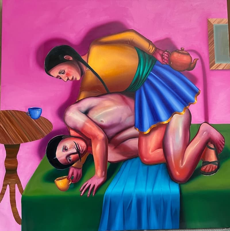 Su práctica evoca escenas teatrales con atmósferas extrañas llenas de metáforas y referencias sociopolíticas. Estas narrativas disparatadas trascienden el lienzo a través de obras escultóricas e instalaciones en las que transporta sus escenas a otra dimensión, invitando al público a formar parte de sus extrañas pantomimas.