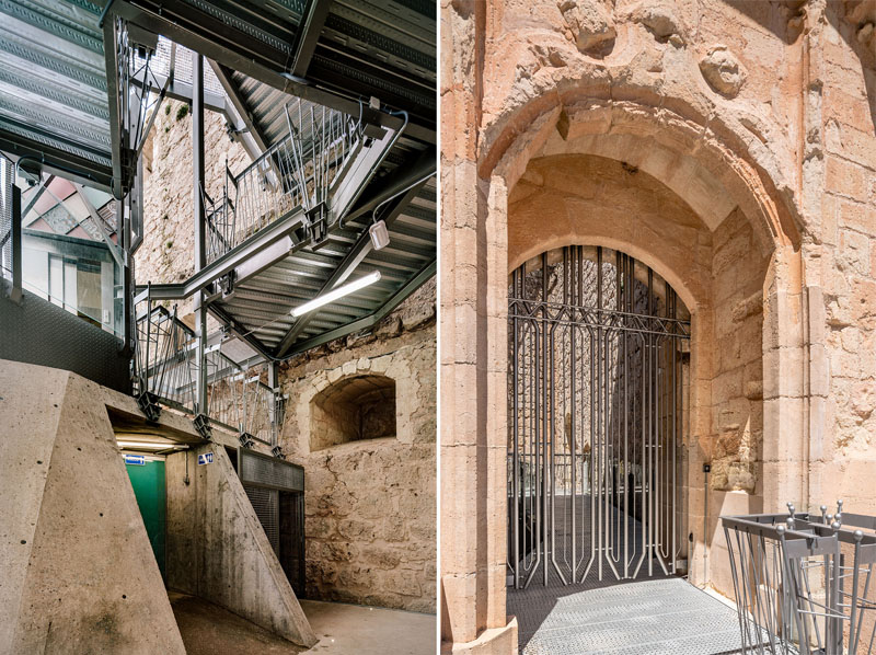Todo tiene un carácter temporal, como explican desde el estudio de Izaskun Chinchilla: “Casi todos los elementos incluidos en el proyecto pueden ser transportados por dos personas y todos pueden ser desmantelados. Se trata de un proyecto completamente reversible. Desde el punto de vista tectónico, la intervención se asemeja más a un mobiliario adherido al inmueble que a una nueva construcción. Esto permite no solo la futura incorporación de otros usos, sino también futuras actualizaciones del equipamiento -con importante presencia de usos digitales- y el traslado de elementos obsoletos a otros emplazamientos.” El material que más se ha utilizado ha sido el acero galvanizado y pintado. Este material tolera una gran durabilidad con escaso mantenimiento y permite, tal como prevé la Carta de Atenas y los acuerdos internacionales posteriores, que la obra nueva se distinga con claridad de la antigua.