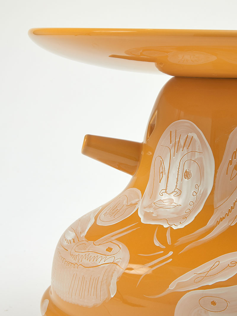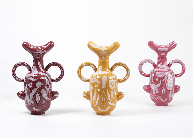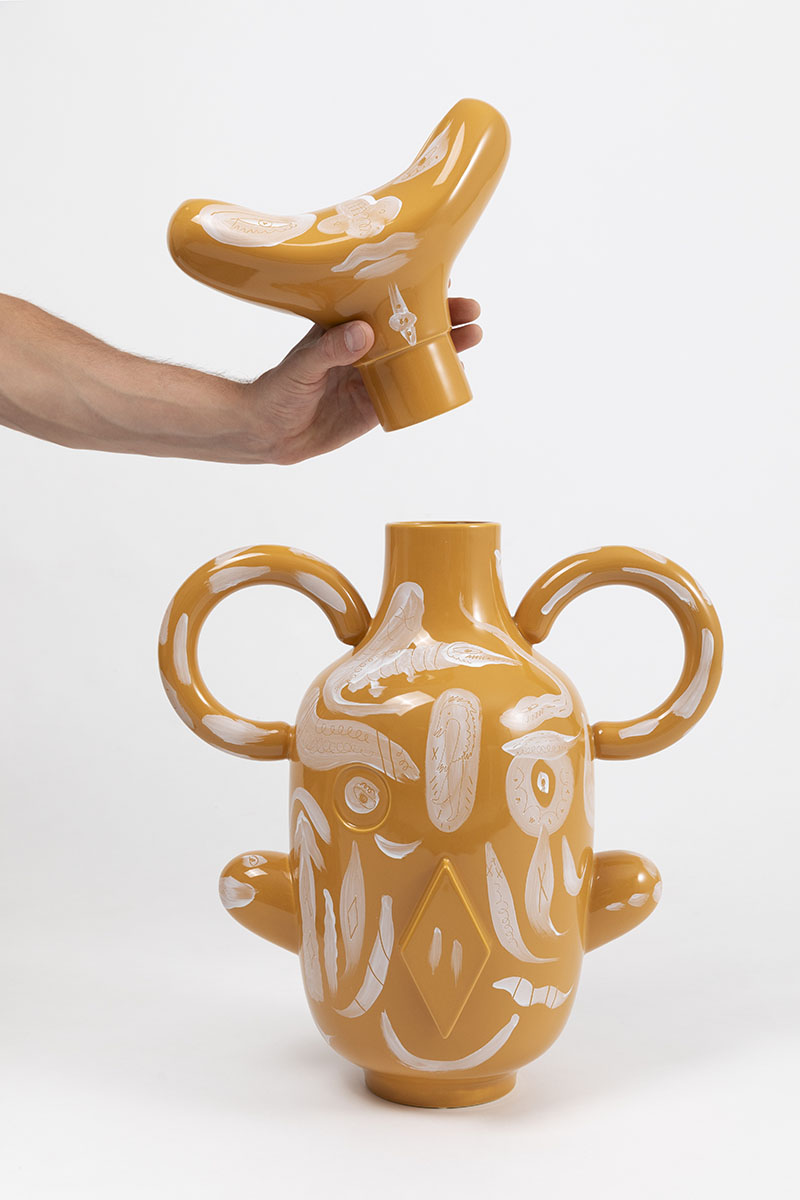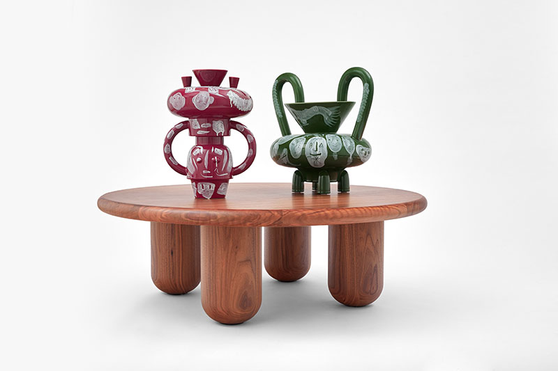 En esta exposición, Jaime Hayon privilegia la artesanía meticulosa y la expresión artística audaz, mostrando una serie de jarrones y candelabros inspirados en el Mediterráneo adornados con rostros expresivos y asas sobredimensionadas junto con mesas de madera de nogal Organism cuidadosamente elaboradas que resuenan con las curvas características de Hayon.