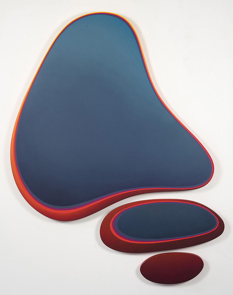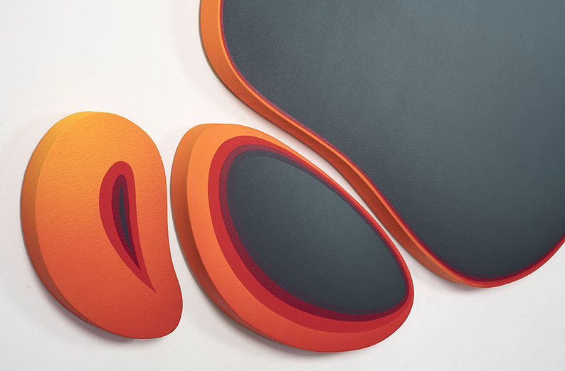 Este trabajo con la forma puede resultar sencillo y obsesivo en las variaciones, pero siempre es en Jan Kalab muy elegante y fino, insistiendo en el juego entre la profundidad cromática, el tiempo de contemplación y el movimiento de la mirada cómplice del espectador, que debe recorrer desde distintos puntos de vista cada pieza, dejándose arrastrar entre las capas para sumergirse en el interior de sus campos de color. El círculo (o la forma circular) es quizás la forma más compleja, la que por su carácter orgánico subraya tanto lo de dentro como lo de afuera, ejemplificando aquel diagrama de fuerzas de Thompson.
