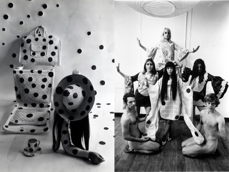 Izq: Yayoi Kusama en su estudio en Nueva York. Der: Show de moda en el estudio de Yayoi Kusama en Nueva York. Ambas 1968, vía David Zwirner Gallery
