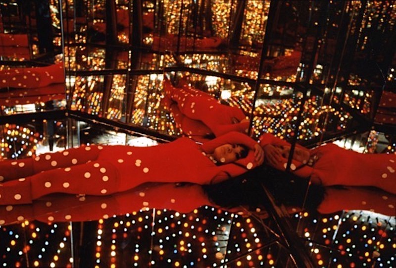 Yayoi Kusama en Infinity Mirrored Room, Love Forever, 1966, vía David Zwirner Gallery