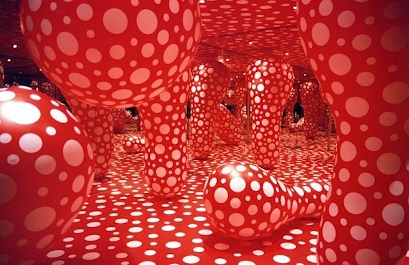 A sus 91 años, Yayoi Kusama, “la princesa de los polka dots (lunares)” ha convertido su obsesión en arte. La pequeña Yayoi sufría alucinaciones tanto visuales como auditivas desde niña. Pintaba lunares de forma compulsiva que la ayudaban a sobrellevar estos extraños sucesos. Esos mismos patrones que la atormentaban, acabarían cubriéndolo todo hasta comenzar a “borrarla” a ella misma. Por eso sus en sus instalaciones ella aparece mimetizandose con los ciruelos que envuelven todo. Según ella misma cuenta, el convertir en arte su obsesión, “salva su vida” del final trágico al que estaba predestinada.